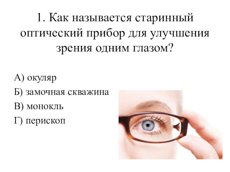 1. Как называется старинный оптический прибор для улучшения зрения одним глазом? А) окуляр Б) замочная скважина В) монокльГ) перископ