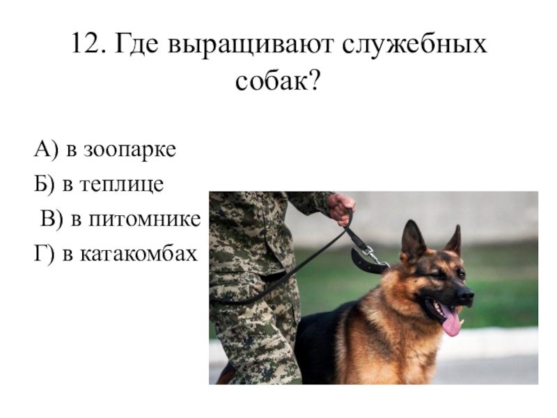 12. Где выращивают служебных собак? А) в зоопарке Б) в теплице В) в питомнике Г) в катакомбах