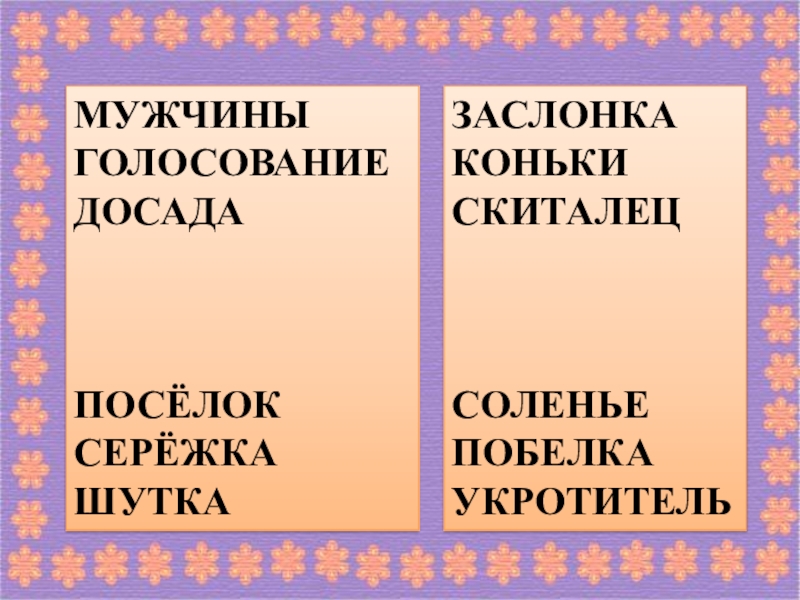 МУЖЧИНЫГОЛОСОВАНИЕДОСАДАПОСЁЛОКСЕРЁЖКАШУТКАЗАСЛОНКАКОНЬКИСКИТАЛЕЦСОЛЕНЬЕПОБЕЛКАУКРОТИТЕЛЬ
