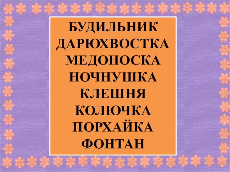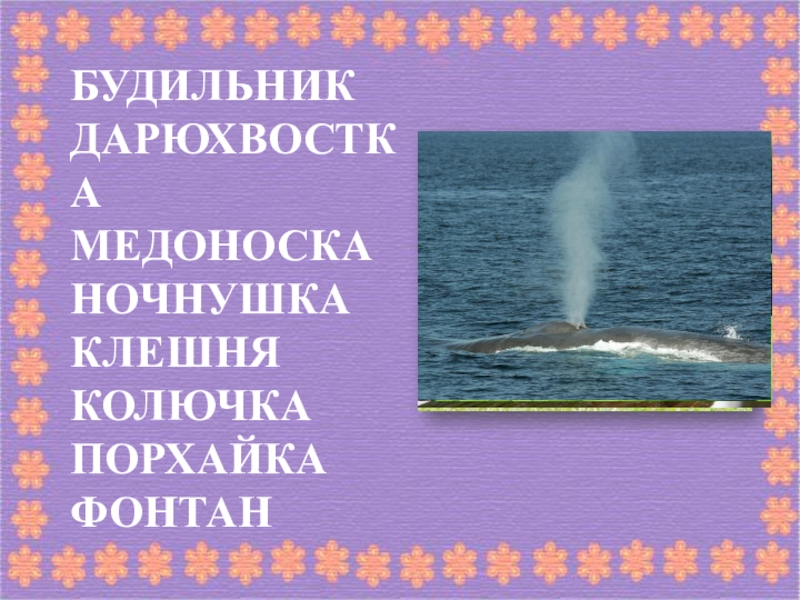 БУДИЛЬНИКДАРЮХВОСТКАМЕДОНОСКАНОЧНУШКАКЛЕШНЯКОЛЮЧКАПОРХАЙКАФОНТАН