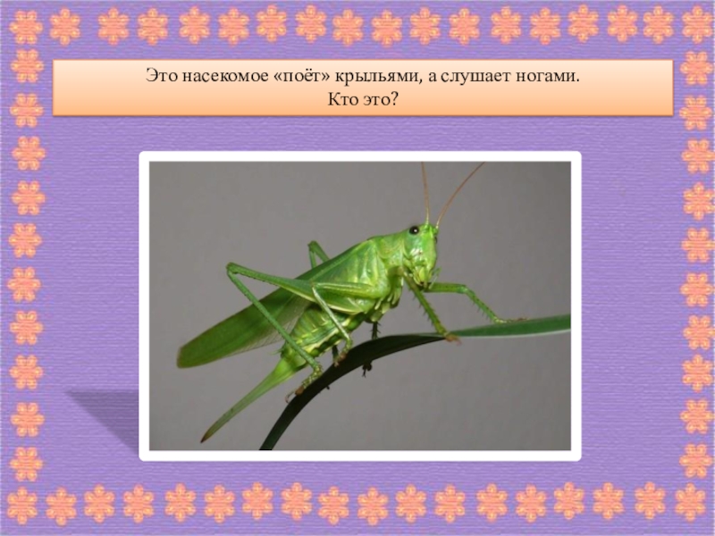 Слайд 33Это насекомое «поёт» крыльями, а слушает ногами.