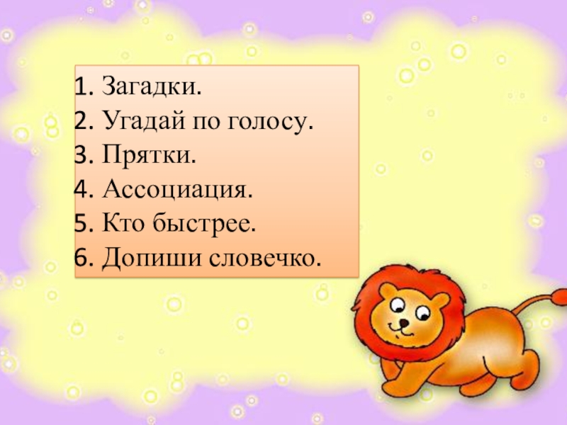 Загадки.Угадай по голосу.Прятки.Ассоциация.Кто быстрее.Допиши словечко.