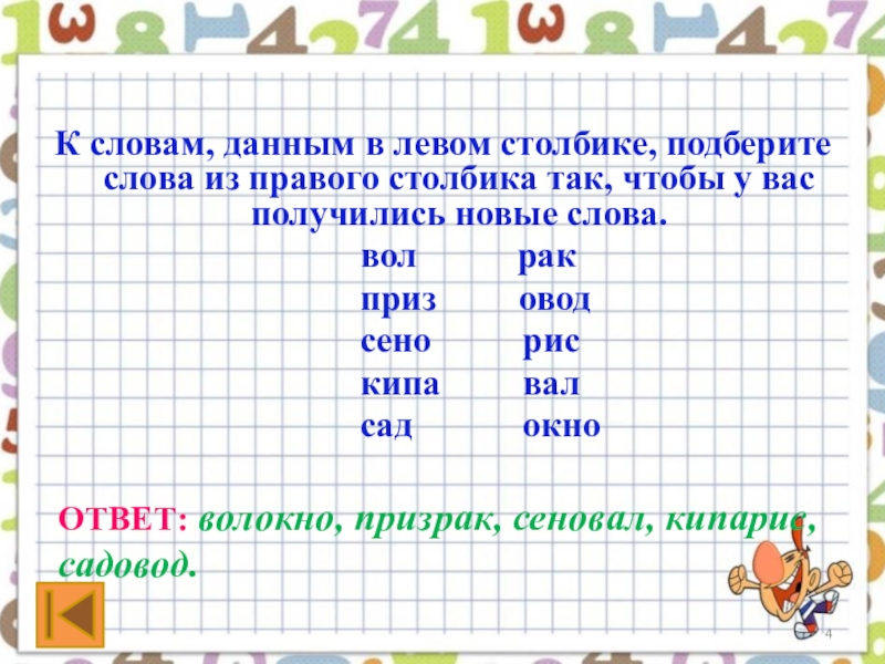 ОТВЕТ: волокно, призрак, сеновал, кипарис, садовод.