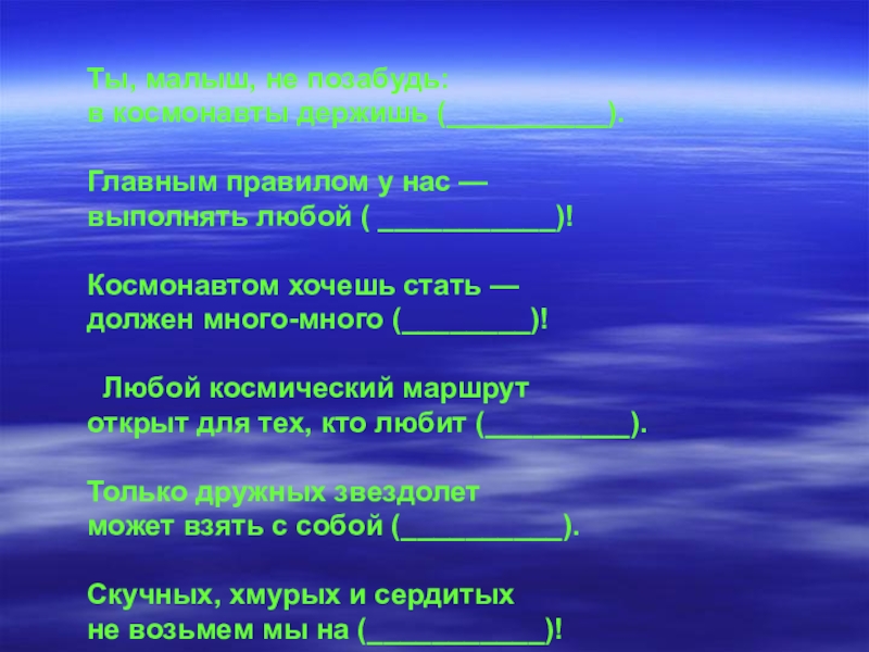 Ты, малыш, не позабудь: в космонавты держишь (__________). Главным правилом у нас — выполнять любой ( ___________)!