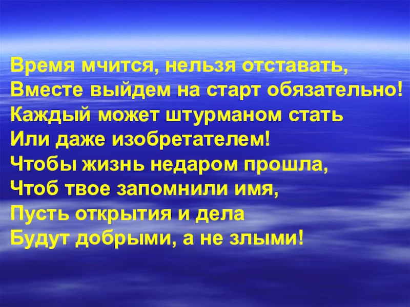 Время мчится, нельзя отставать, Вместе выйдем на старт обязательно! Каждый может штурманом стать Или даже изобретателем! Чтобы