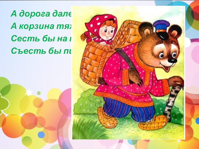 А дорога далека.А корзина тяжела.Сесть бы на пенек,Съесть бы пирожок.