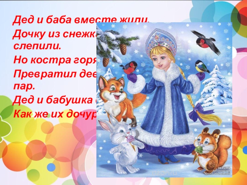 Дед и баба вместе жили,Дочку из снежка слепили.Но костра горячий жар Превратил девчурку в пар.Дед и бабушка