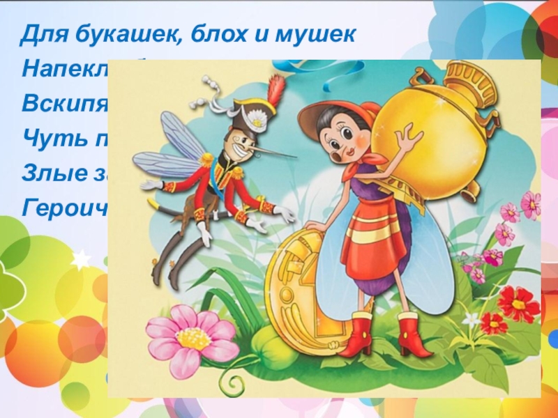 Для букашек, блох и мушекНапекла блинов и плюшекВскипятила самовар.Чуть паук меня не скушал.Злые замыслы разрушилГероический комар.
