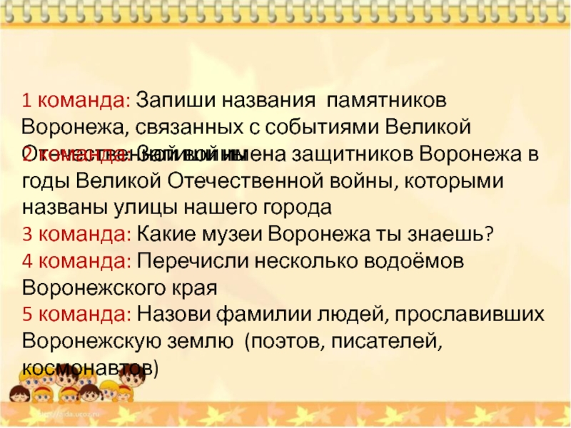 5 команда: Назови фамилии людей, прославивших Воронежскую землю (поэтов, писателей, космонавтов)