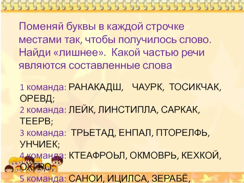 4 команда: КТЕАФРОЬЛ, ОКМОВРЬ, КЕХКОЙ, ОХГРО;