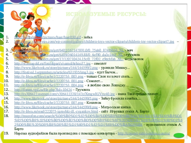 http://muzofon.com/search/%D0%B0%D1%83%D0%B4%D0%B8%D0%BE%D1%81%D1%82%D0%B8%D1%85%D0%B8%20%D0%B0%D0%B3%D0%BD%D0%B8%D1%8F%20%D0%B1%D0%B0%D1%80%D1%82%D0%BE%20%D0%B8%D0%B3%D1%80%D1%83%D1%88%D0%BA%D0%B8 – аудиозаписи стихов А.Барто
