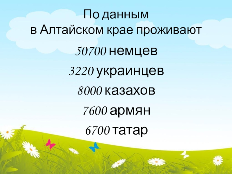 По данным в Алтайском крае проживают50700 немцев3220 украинцев8000 казахов7600 армян6700 татар