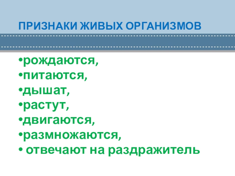 ПРИЗНАКИ ЖИВЫХ ОРГАНИЗМОВрождаются, питаются, дышат, растут, двигаются, размножаются, отвечают на раздражитель