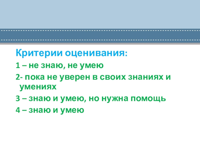 Критерии оценивания:1 – не знаю, не умею2- пока не уверен в своих знаниях и умениях3 – знаю