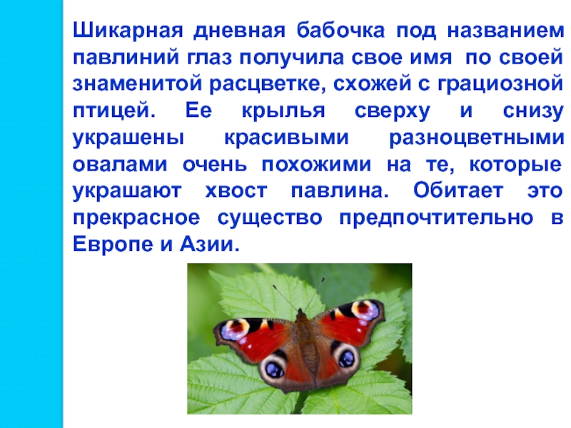 своей знаменитой расцветке, сxожей с грациозной птицей. Ее крылья сверху и снизу украшены красивыми разноцветными овалами очень похожими на те, которые украшают хвост павлина. Обитает это прекрасное существо предпочтительно в Европе и Азии.
