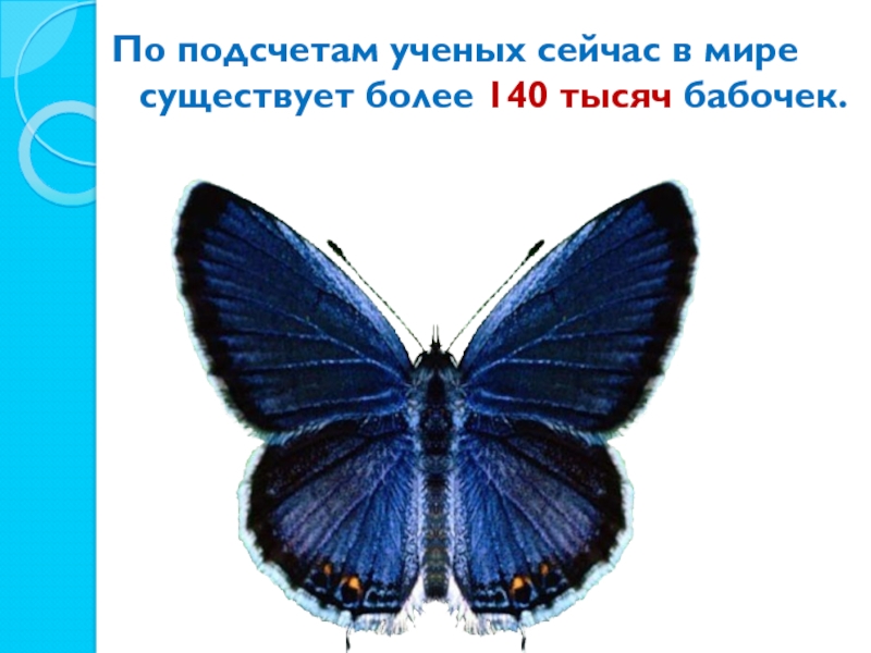 Слайд 27По подсчетам ученых сейчас в мире существует более 140 тысяч бабочек.