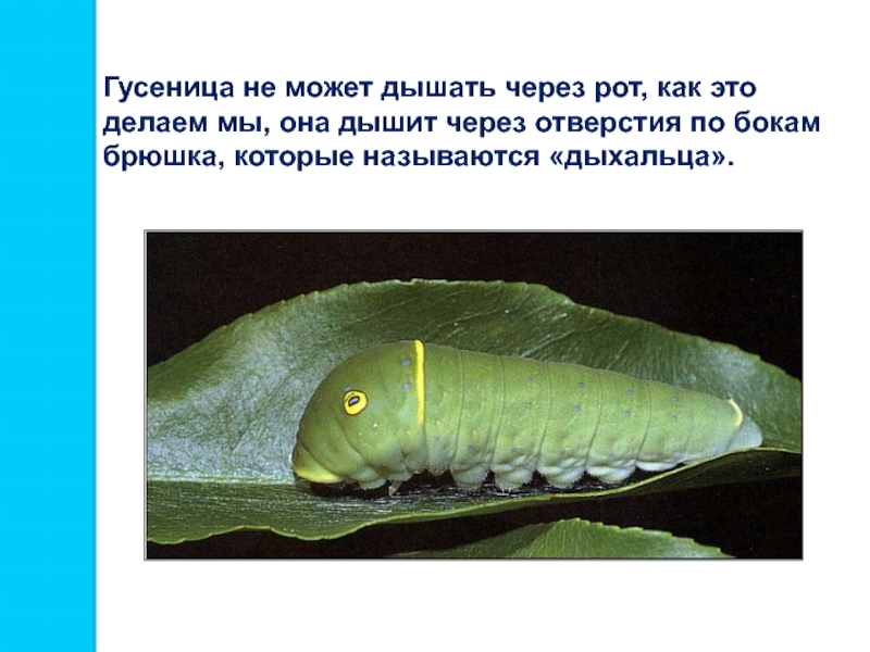 Слайд 16Гусеница не может дышать через рот, как это делаем мы, она
