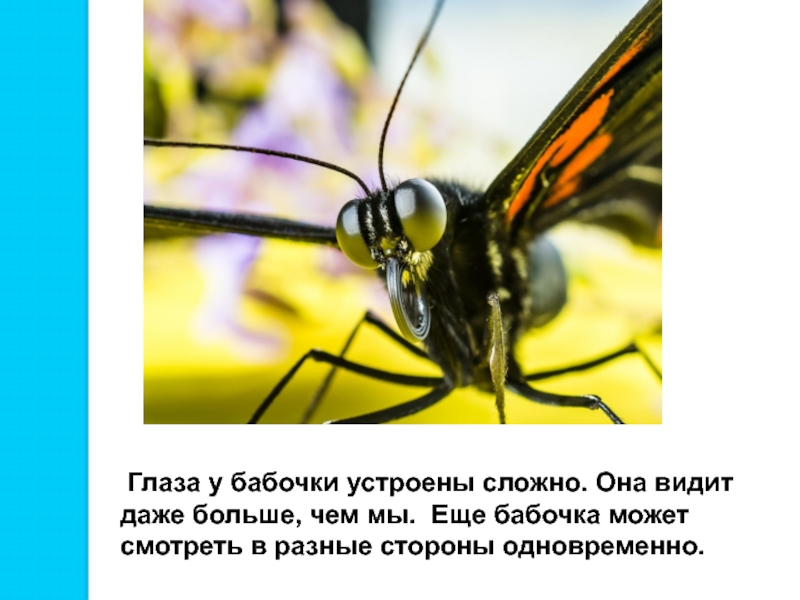 Слайд 25 Глаза у бабочки устроены сложно. Она видит даже больше, чем