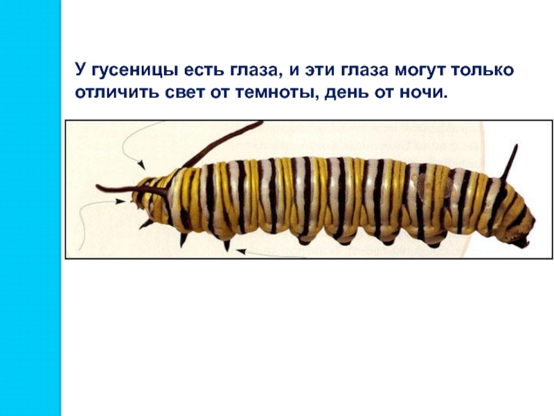 Слайд 15У гусеницы есть глаза, и эти глаза могут только отличить свет