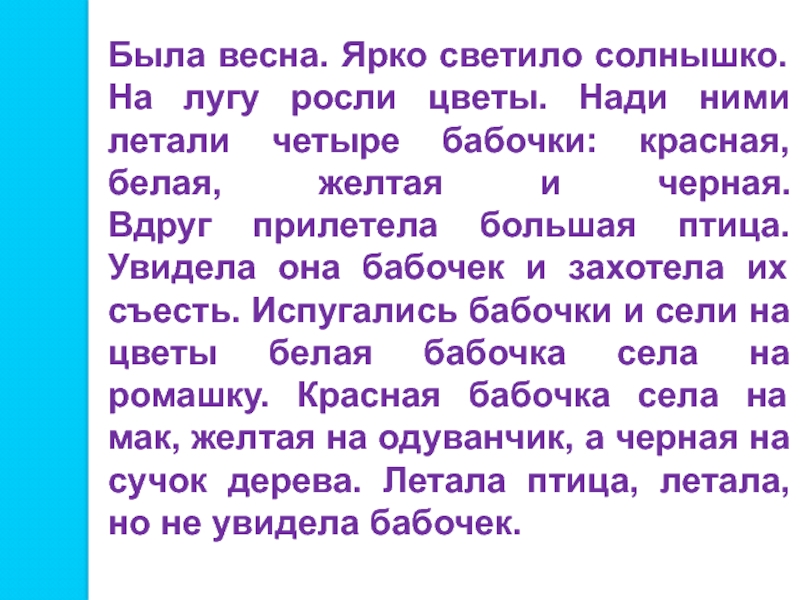 Вдруг прилетела большая птица. Увидела она бабочек и захотела их съесть. Испугались бабочки и сели на цветы белая бабочка села на ромашку. Красная бабочка села на мак, желтая на одуванчик, а черная на сучок дерева. Летала птица, летала, но не увидела бабочек.