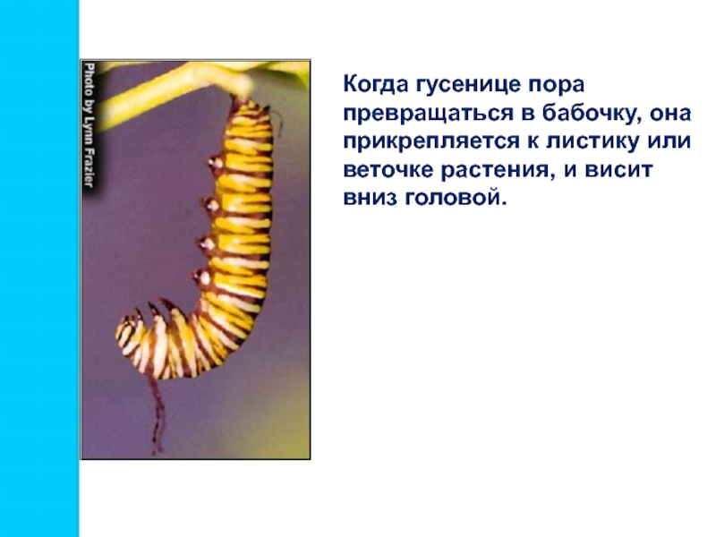 Слайд 17Когда гусенице пора превращаться в бабочку, она прикрепляется к листику или