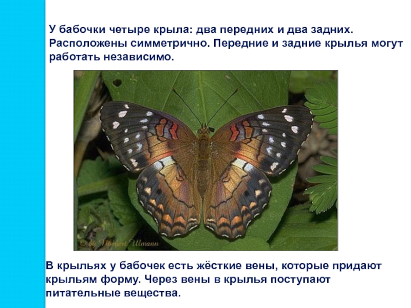 Слайд 22У бабочки четыре крыла: два передних и два задних. Расположены симметрично.