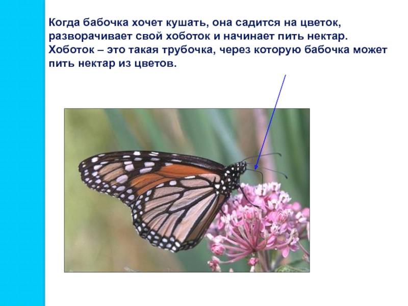 Слайд 23Когда бабочка хочет кушать, она садится на цветок, разворачивает свой хоботок