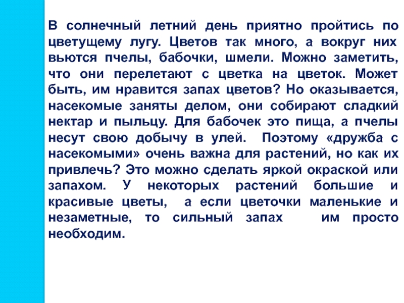 много, а вокруг них вьются пчелы, бабочки, шмели. Можно заметить, что они перелетают с цветка на цветок. Может быть, им нравится запах цветов? Но оказывается, насекомые заняты делом, они собирают сладкий нектар и пыльцу. Для бабочек это пища, а пчелы несут свою добычу в улей. Поэтому «дружба с насекомыми» очень важна для растений, но как их привлечь? Это можно сделать яркой окраской или запахом. У некоторых растений большие и красивые цветы, а если цветочки маленькие и незаметные, то сильный запах им просто необходим.