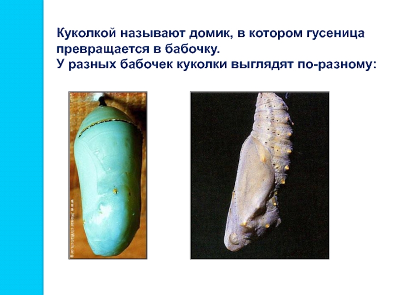 Слайд 19Куколкой называют домик, в котором гусеница превращается в бабочку.