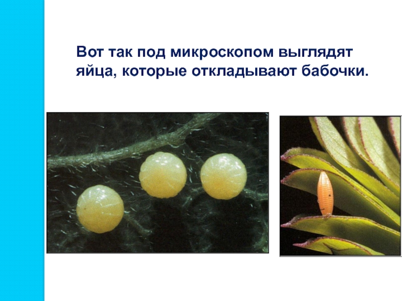 Слайд 13Вот так под микроскопом выглядят яйца, которые откладывают бабочки.