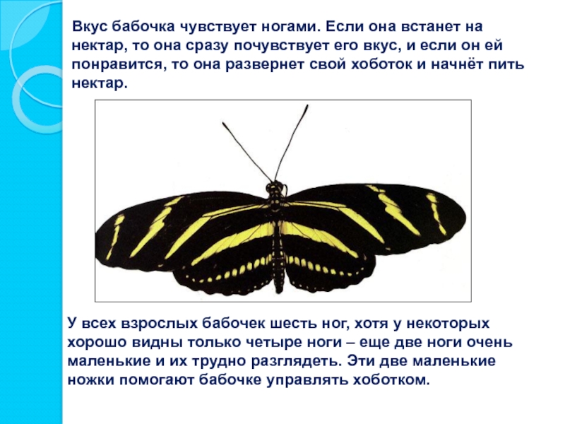 только четыре ноги – еще две ноги очень маленькие и их трудно разглядеть. Эти две маленькие ножки помогают бабочке управлять хоботком.
