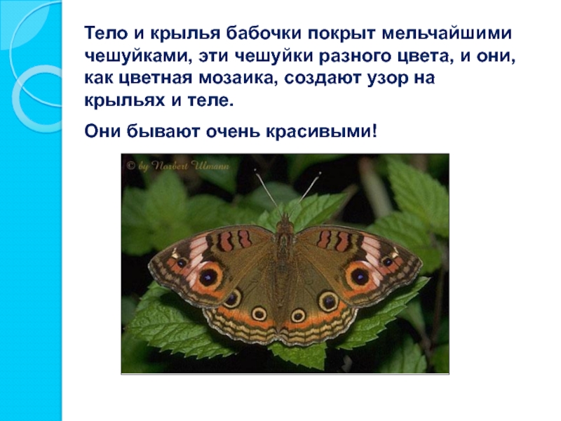 Слайд 26Тело и крылья бабочки покрыт мельчайшими чешуйками, эти чешуйки разного цвета,