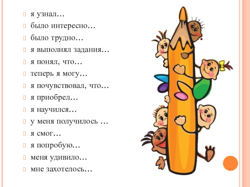 я узнал…было интересно…было трудно…я выполнял задания…я понял, что…теперь я могу…я почувствовал, что…я приобрел…я научился…у меня получилось …я