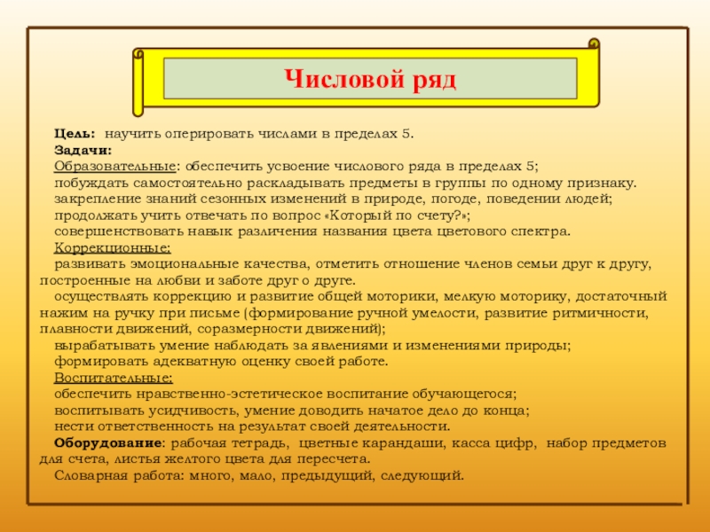 Образовательные: обеспечить усвоение числового ряда