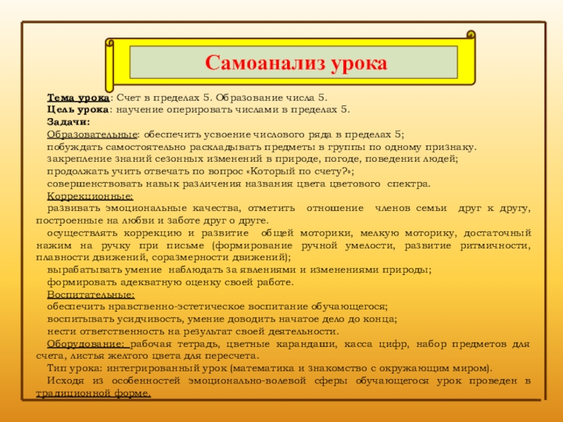 Оборудование: рабочая тетрадь, цветные карандаши, касса цифр, набор предметов для счета, листья желтого цвета для пересчета.