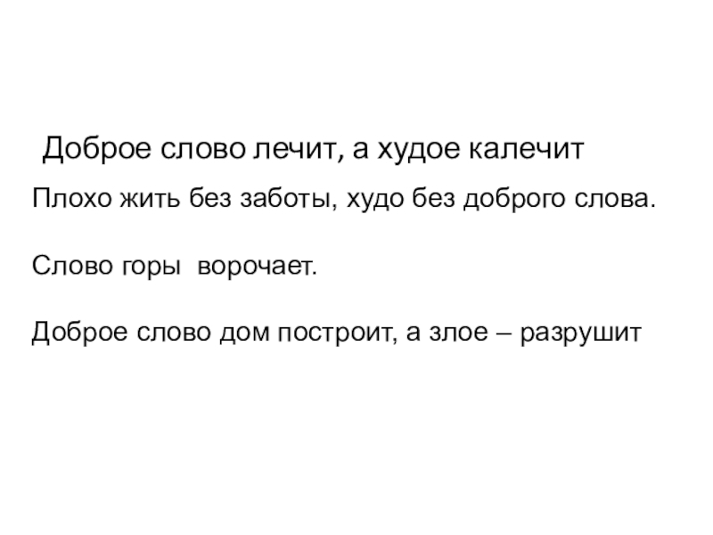 Доброе слово лечит, а худое калечит Плохо жить без заботы, худо без доброго слова.Слово горы ворочает.Доброе слово