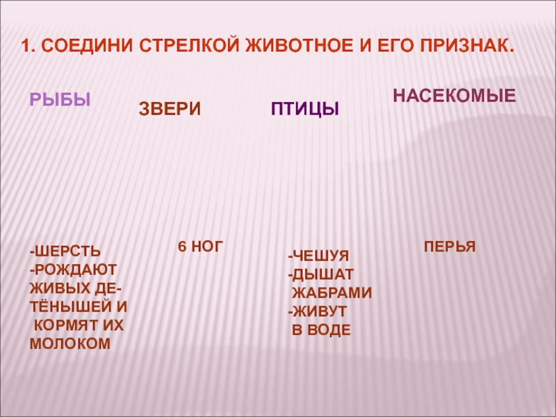 НАСЕКОМЫЕРЫБЫПТИЦЫЗВЕРИ6 НОГ-ЧЕШУЯ-ДЫШАТ ЖАБРАМИ-ЖИВУТ В ВОДЕПЕРЬЯ-ШЕРСТЬ-РОЖДАЮТ ЖИВЫХ ДЕ-ТЁНЫШЕЙ И КОРМЯТ ИХ МОЛОКОМ1. СОЕДИНИ СТРЕЛКОЙ ЖИВОТНОЕ И ЕГО ПРИЗНАК.