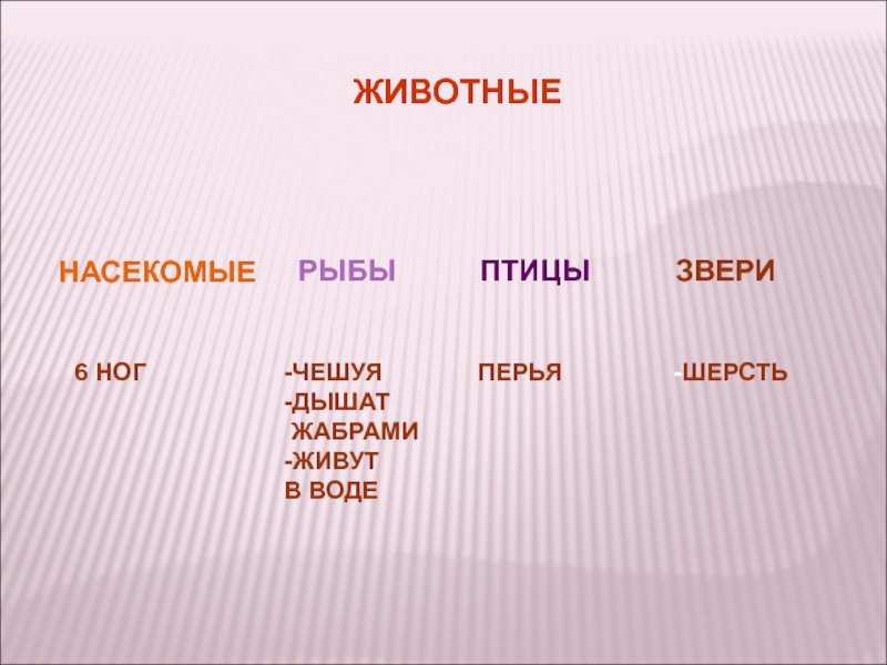 ЖИВОТНЫЕНАСЕКОМЫЕРЫБЫПТИЦЫЗВЕРИ6 НОГ-ЧЕШУЯ-ДЫШАТ ЖАБРАМИ-ЖИВУТ В ВОДЕПЕРЬЯ-ШЕРСТЬ