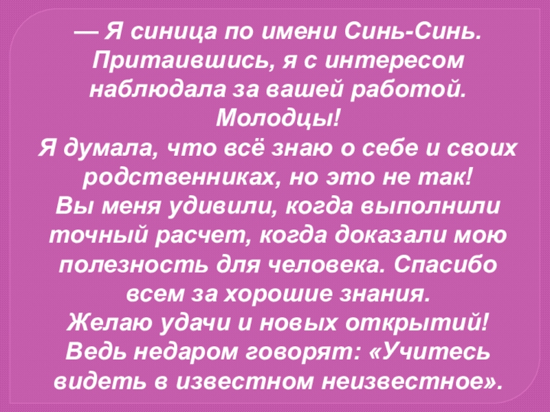 — Я синица по имени Синь-Синь. Притаившись, я с интересом наблюдала за вашей работой. Молодцы! Я думала,