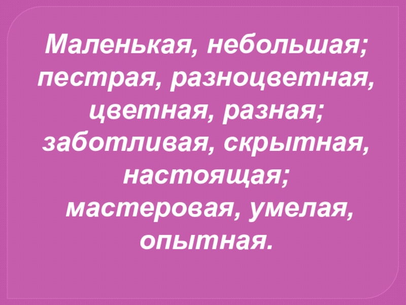 Маленькая, небольшая; пестрая, разноцветная, цветная, разная; заботливая, скрытная, настоящая; мастеровая, умелая,опытная.