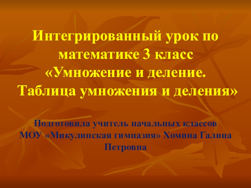 Интегрированный урок по математике 3 класс «Умножение и деление. Таблица умножения и деления» Подготовила учитель начальных классов МОУ «Микулинская гимназия» Хомина Галина Петровна