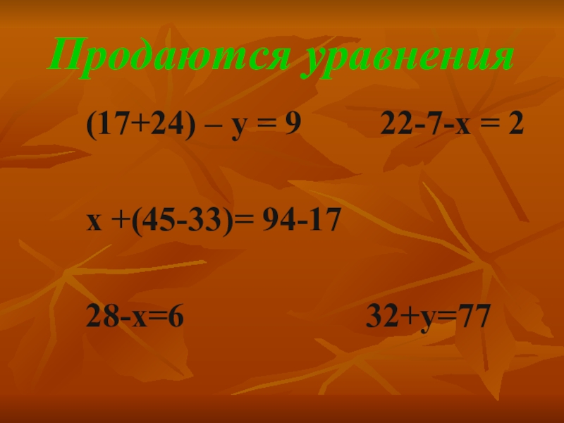 Продаются уравнения   (17+24) – у = 9     22-7-х = 2