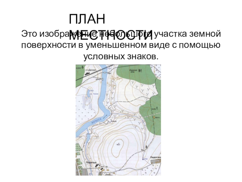 ПЛАН МЕСТНОСТИЭто изображение небольшого участка земной поверхности в уменьшенном виде с помощью условных знаков.