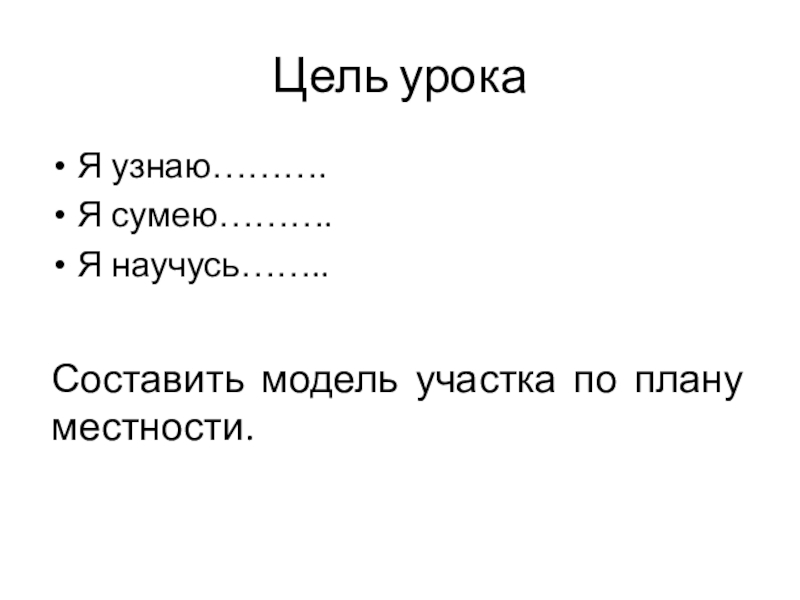 Цель урокаЯ узнаю……….Я сумею……….Я научусь……..Составить модель участка по плану местности.