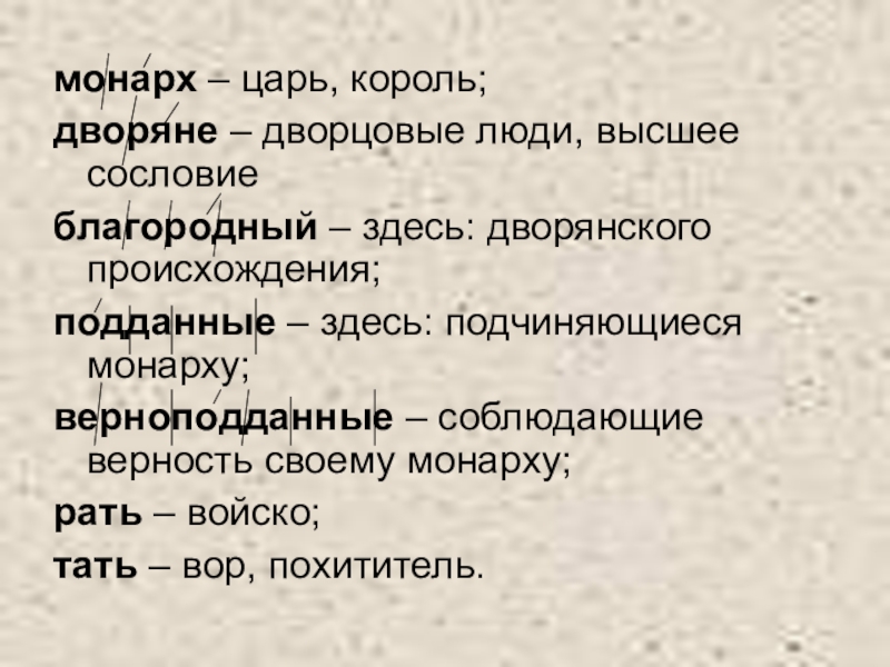 монарх – царь, король; дворяне – дворцовые люди, высшее сословиеблагородный – здесь: дворянского