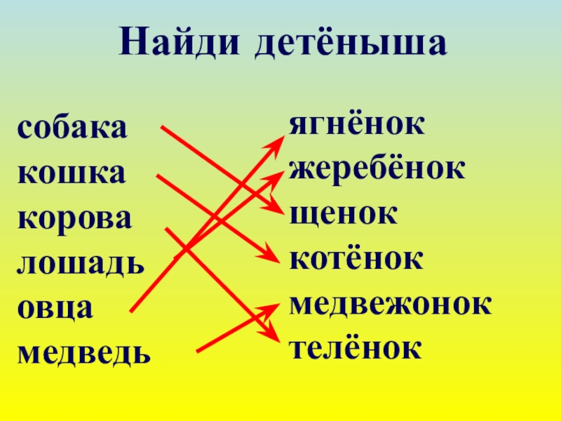 Найди детёнышасобакакошкакоровалошадьовцамедведьягнёнокжеребёнокщеноккотёнокмедвежоноктелёнок