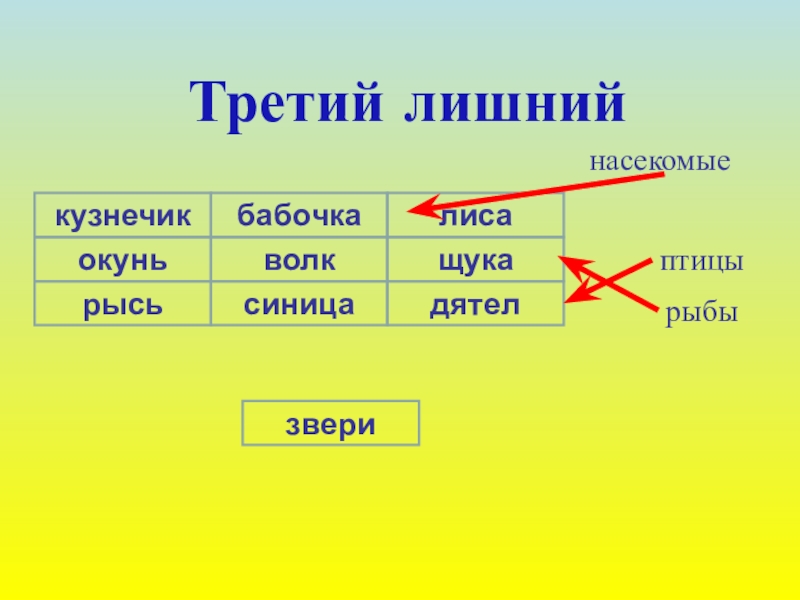 Третий лишнийкузнечикбабочкалисаокуньволкщукарысьсиницадятелптицырыбынасекомыезвери