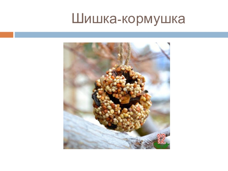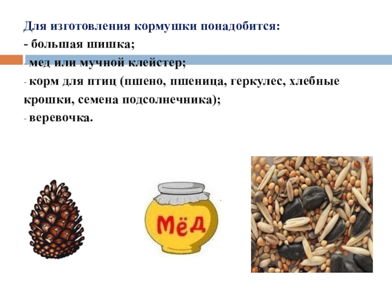 Слайд 13 Для изготовления кормушки понадобится: - большая шишка; - мед или мучной клейстер; - корм