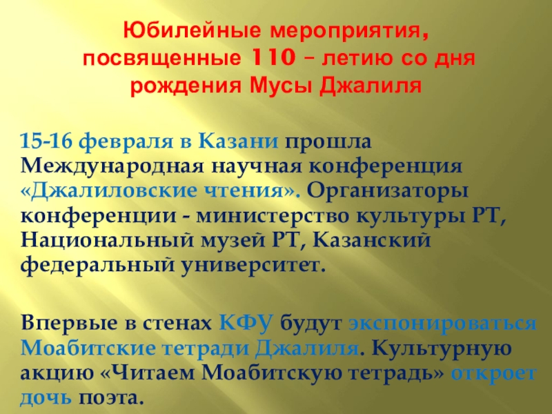 февраля в Казани прошла Международная научная конференция «Джалиловские чтения». Организаторы конференции - министерство культуры РТ, Национальный музей РТ, Казанский федеральный университет.
