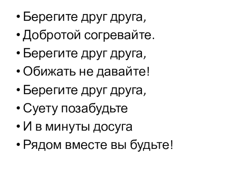 Берегите друг друга,Добротой согревайте.Берегите друг друга,Обижать не давайте!Берегите друг друга,Суету позабудьтеИ в минуты досугаРядом вместе вы будьте!